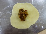 【フィリング】フライパンに油(分量外)をひき、挽肉、玉ねぎを炒めながら塩、こしょうをします。火が通れば、かぼちゃペースト、くるみ、レーズン、スパイス類を加えて混ぜ合わせ全体的になじんできたらバット等に入れて冷まします。