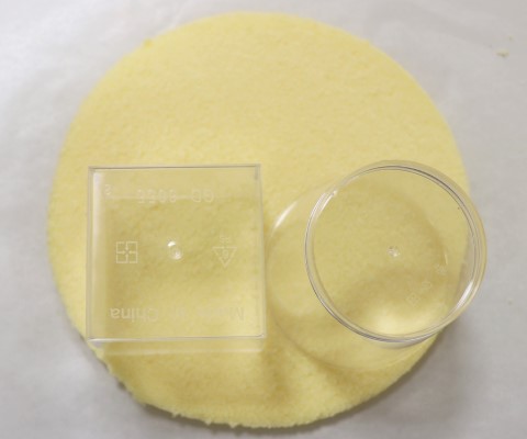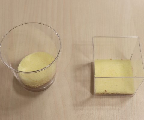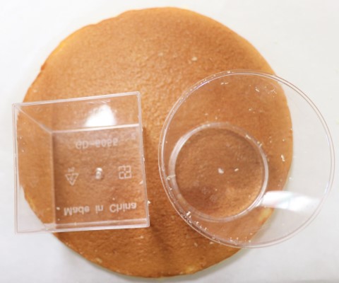 1/2に切れているスポンジの一枚をさらに半分になるようにスライスし、型に合うようにカットします。(1コのカップにつき底と上の生地の合計2枚)カップにあわせてスポンジに跡をつけると便利です。