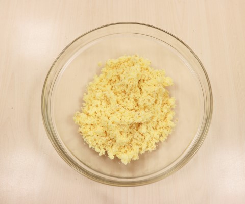 ボウルにスポンジケーキをちぎり入れ、フォーク等を使って細かくします。