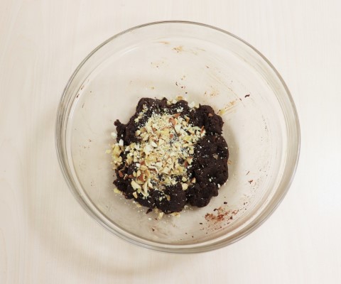 お好みで細かく刻んだ素焼きミックスナッツを加えて混ぜ、生地がまとまるまであわせます。