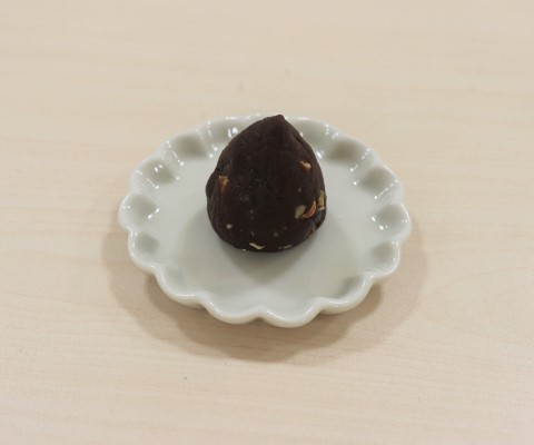 ④を6等分し、ラップ材で1コずつ包み松ぼっくりの形に円錐状(底が平らのしずく型)に丸めます。(お好みのサイズで作ってOKです)やわらかい場合は冷蔵庫で約10分冷やします。