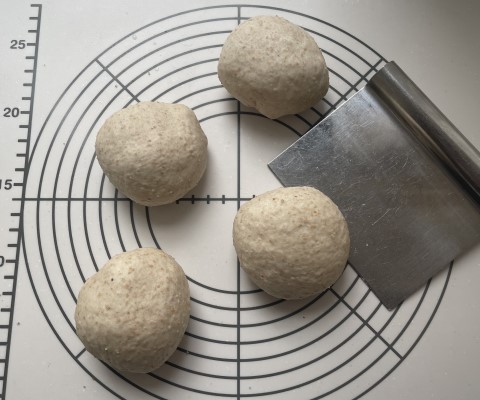 ➀のパン生地を4つに分けて丸め、タッパーなどに入れてまた冷蔵庫に入れておきます。