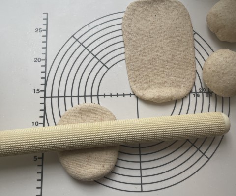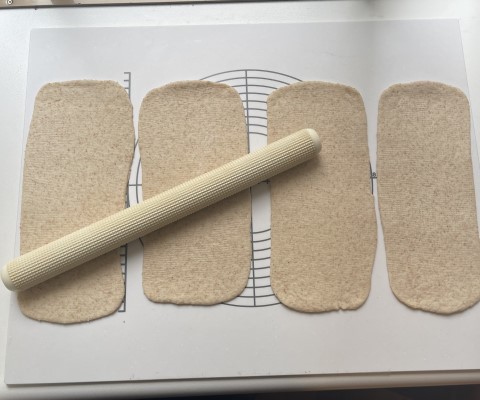 とじ目はしっかり指先で摘んで、パン生地が開かないようにし、繰り返し使えるオーブン用シート(または打ち粉(分量外)をしたオーブン用シート)で軽く包み、他の3本の包み込み作業が終わるまで、冷蔵庫で寝かせておきます。