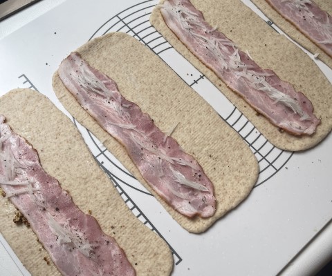 冷蔵庫から④のパン生地を1枚取り出します。端を1cmあけてベーコンを敷き、スライスオニオン、マヨネーズ、粒マスタードをのせます。(お好みで黒胡椒も少々)