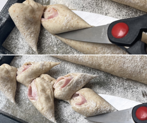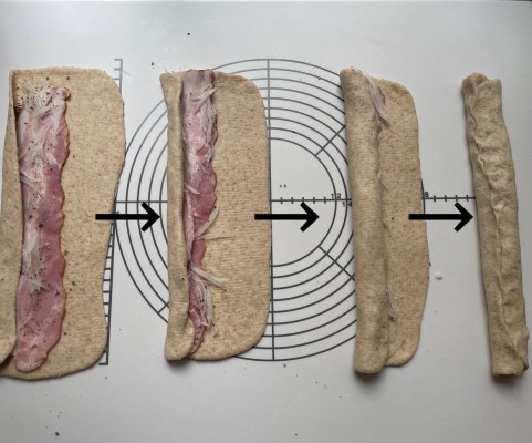 端から1cmの所で、ドレッジ(またはスケッパーなど)を使って、パン生地をおります。ベーコンを半分に折りながらパン生地を折りたたみます。具の乗っていない方のパン生地を折りたたみながら、具材を全部包み込みます。