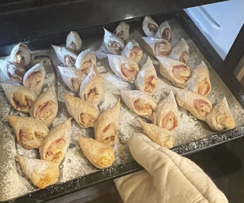 もし弱め(普段焼き色があまりつかないオーブン)の場合 240度くらい。ただし、焼き時間や温度は、各ご家庭で調整してください。パリッと焼ければOKです。