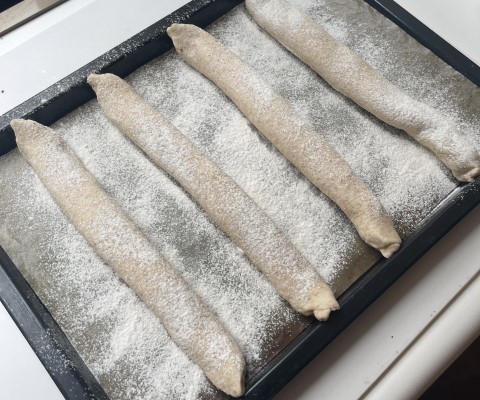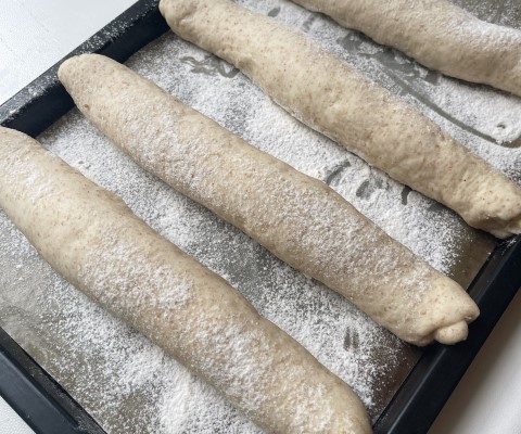 天板に、打ち粉(分量外)をしたオーブン用シートを敷いて、4本の生地を冷蔵庫から出してとじ目を下にして並べ、全体的に軽く打ち粉(分量外)をします。