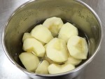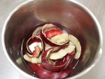 - りんごは四つ割りにして芯を取り除き重さを計量してから塩水(分量外)につけておきます。