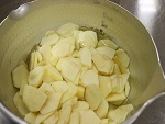 - りんごは薄いいちょう切りにして鍋に砂糖(りんごの重さの50%ほど)と共に入れ、砂糖をりんご全体にまぶします。1~2時間経つとりんごから水分が出てきます。