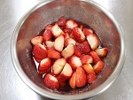 - いちごは手早く洗い、ヘタを取ってボウルに入れます。(いちごが大きい場合にはお好みの大きさに切ります。)そこに、グラニュー糖を入れてボールをゆすりながらいちご全体にグラニュー糖をまぶし、約2時間おきます。