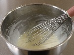 ボウルに卵白を入れ、牛乳を加えた後、米粉のホットケーキミックスを入れ、泡立て器でとろみが出るまで約1分間しっかりと混ぜます。