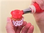 バラ口金(しずくの形をしています)の丸い部分を下にし、マフィンに垂直に当てます。中心にひと巻き、芯を絞り、周囲に花弁を絞っていきます。左右に小刻みに動かしながら、カーネーションの花弁のひだを出していきます。