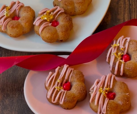 タイパ抜群の「ミックス粉」を使ってキュートなお花型のいちごのフィナンシェを作ろう! バレンタインのプレゼントにおすすめです! 米粉のなめらかな食感をお楽しみください。