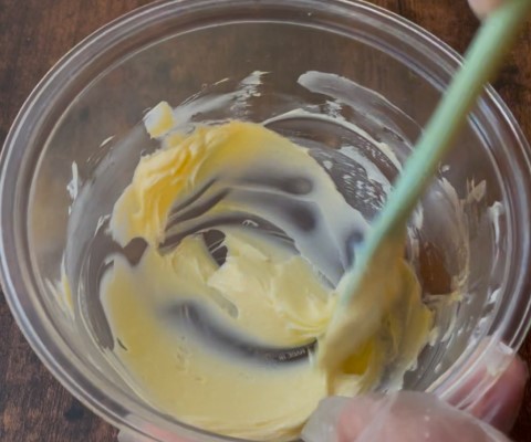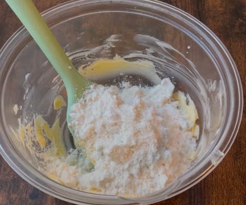卵白を加え泡立て器でなめらかになるまでよく混ぜます。