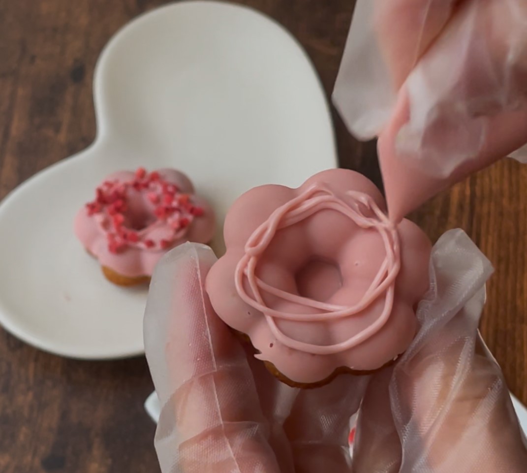 ボウル(小)に40~50℃のお湯を入れ、デコペンをつけます。チョコレートがやわらかくなったら取り出して、タオルに包みよくもみます。ペン先を指でねじり切り、⑪に模様を描きます。