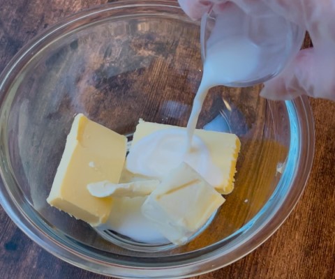 電子レンジ対応容器にバターと牛乳を入れ、500~600wの電子レンジで10秒ずつ加熱し、溶かします。(※オート(自動)機能は使用しないでくたさい)