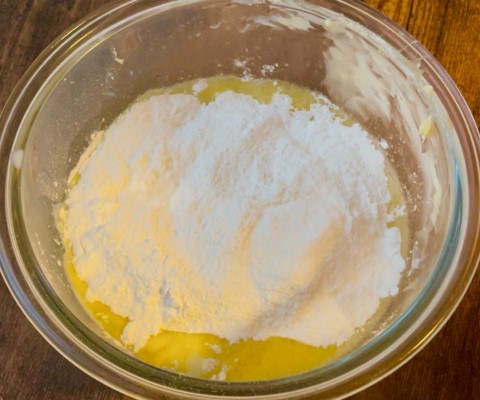 ①にミックス粉(※脱酸素剤は取り除いてくたさい)を加えます。