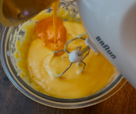 卵を加え泡立て器で約1分なめらかになるまで混ぜます。