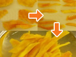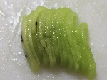 - マンゴーを1枚ずつ丁寧にはがし、2~3等分(約7㎜)の幅にカットして、厚みがあるものは、薄くスライスしておきます。容器に入れたマンゴーがひたひたにつかる位の水(分量外)に入れ、冷蔵庫で柔らかくなるまで約2~3時間つけておきます。