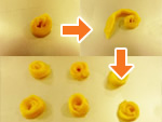 の水気をペーパータオルで取ります。短いマンゴーを中心に巻き、長めのマンゴーを外側に巻いて形を整え、飾り用のバラを作り、トレーの上にのせて冷蔵庫で冷やしておきます。(※厚みがあり巻きにくい時は、厚みをスライスすると巻きやすくなります。)飾り以外の残りのマンゴーは細かく刻んで冷蔵庫で冷やしておきます。