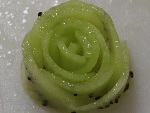 キウイは洗って皮をむき、縦半分にカットし、薄くスライスします。短いキウイのスライスを中心に巻き、長めのキウイのスライスを外側に巻いて形を整え、飾り用のバラを作り、トレーの上にのせて冷蔵庫で冷やしておきます。飾り以外の残りのキウイは細かく刻んで冷蔵庫で冷やしておきます。