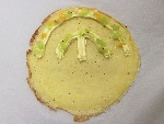 オーブン用シートの上に⑤の生地を置き、生クリームを生地の外周とその内側に絞り、小さい半円の真ん中に縦に絞ります。クリームの上にカットしたフルーツをおきます。