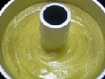 ④を天板にのせたシフォン型に生地を流し入れ、180℃に温めたオーブンで約45分、竹串をさしてぬれた生地がつかなくなるまで焼きます。