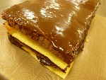 チョコ、あんず、クルミ、プレーンの順に4段に重ねて冷蔵庫で冷やします。 全体にチョコレートクリームをぬり、好みにデコレーションをします。