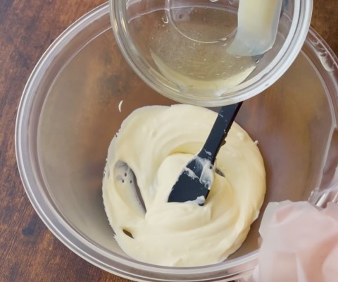 ゼラチンパウダーを水でふやかし、500wの電子レンジで10秒温めて溶かしておきます。〈A〉
