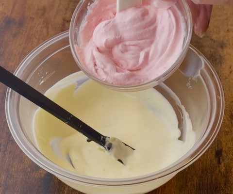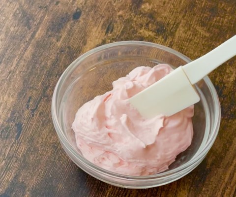 別のボウルで、生クリームにグラニュー糖10gを加えてを軽くホイップ(六分~七分立て)したら、食用色素 赤を水で溶いたもの〈B〉を加えて着色し、ピンク色にします。
