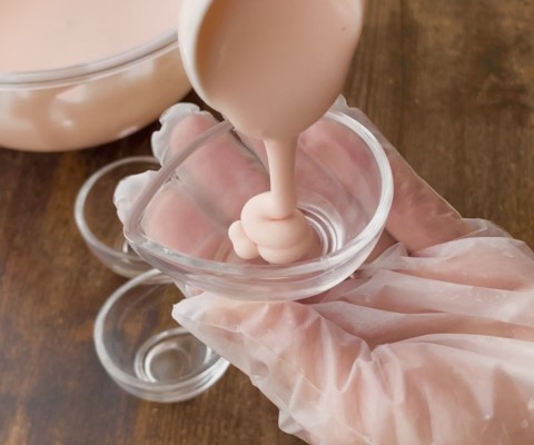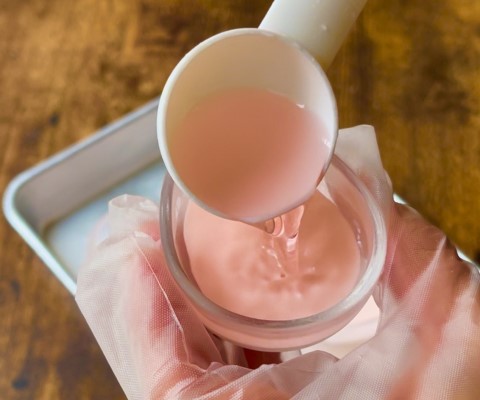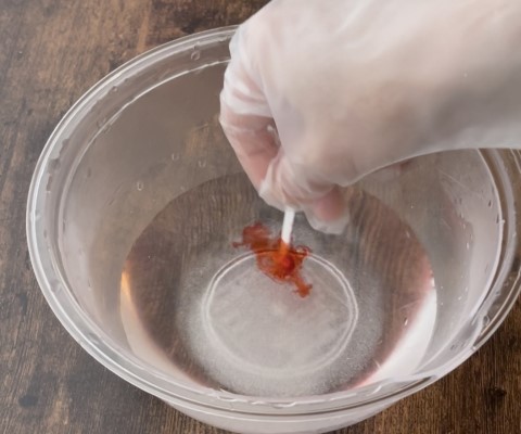 熱湯にゼラチンパウダーを直接加えて溶かし、グラニュー糖30gを加えて混ぜたら、ゼリー用の食用色素 赤を、色の濃さを見ながら直接加えて混ぜます。