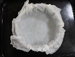 - 型にオーブン用シートを大きめにカットし、くしゃくしゃに敷いておきます。バスク風チーズケーキは一度膨らんでから冷めると沈むため、型より大きめに敷いておきます。