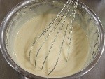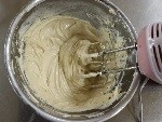 溶きほぐしておいた卵を3回に分けて加え、その都度ハンドミキサーで混ぜ、生クリームとバニラオイルを加えて混ぜます。