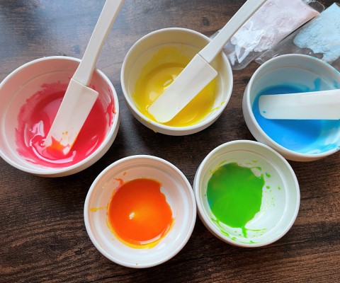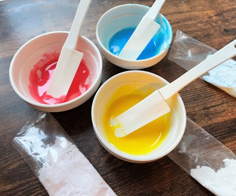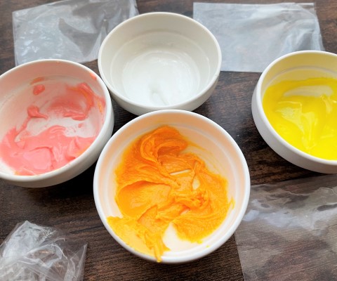 アイシングシュガー(3色)をそれぞれ10gずつに対して水を小さじ1/3足して溶き、ピンク・ブルー、イエローの3色のアイシングを作ります。