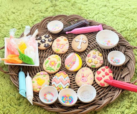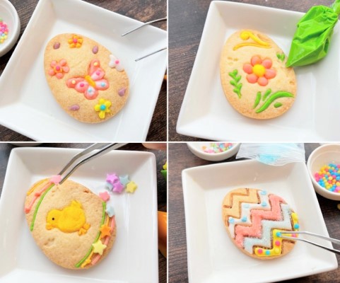冷ました米粉のクッキーに、アイシングを絞り、乾かないうちにお好みのトッピングを飾ります。