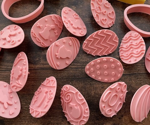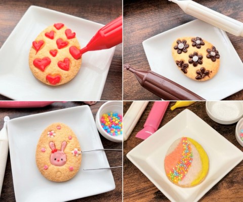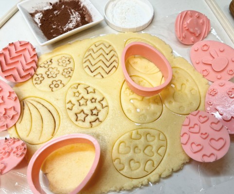 ●卵の形の抜き型は、ネットを見るとたくさん揃っています。または100円ショップの丸型を、手で少し変形させて楕円形にしたり、綺麗に洗った牛乳パックやプラバンで自作することもできます。