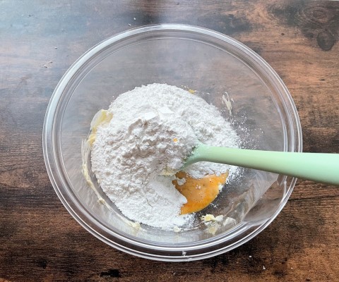 柔らかくなったバターに、粉糖、溶き卵、アーモンドプードル、米粉をよく混ぜます。