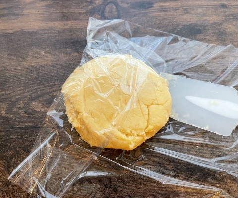 生地をひとかたまりにまとめ、ラップ材で包んで15分ほど冷蔵庫で休ませます。