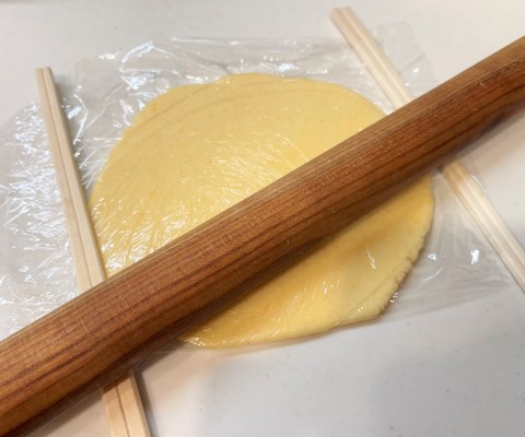 生地をラップ材の間に挟み、5mmの厚さに伸ばします。