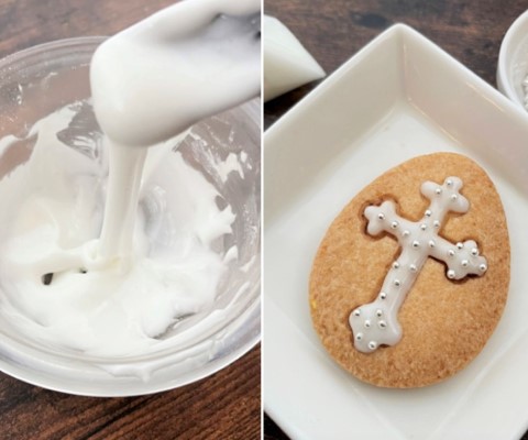 白のアイシングは、粉糖に水を足してよく練ります。(水の代わりに牛乳や卵白でも作ることができます)固まる前にアラザンなどをつけて飾ります。