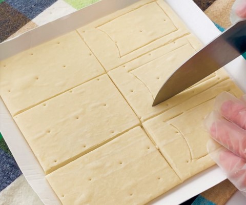市販の正方形のパイシートを6等分します。3枚はそのままの形で使用し、残りの3枚はナイフで切り込みを入れます。
