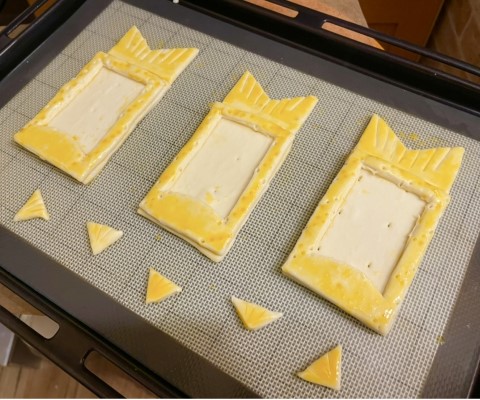 オーブン用シートを敷いた天板に、尻尾をおいて照り卵をし、そこへ1㎝重ねるようにして、くり抜いていないパイシートをのせ、押さえます。そしてまわりに照り卵をして、くり抜いたパイシートを重ね、上から軽く押さえつつフォークで穴をあけます。