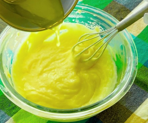 耐熱ボウルに卵、グラニュー糖を入れて泡立て器で白っぽくなるまで混ぜ、米の粉を加え混ぜます。