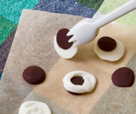 ボウルに40~50℃のお湯を入れ、デコペンを3~4分つけます。チョコがやわらかくなったら取り出して、タオルに包んでよくもみ、先端をねじり切ります。デコペンブラックで直径1.5㎝の丸を描きます。冷やし固めたらそこへデコペンホワイトで直径2㎝くらいの丸を重ねて描き、冷蔵庫で冷やし固めてから表に返します。
