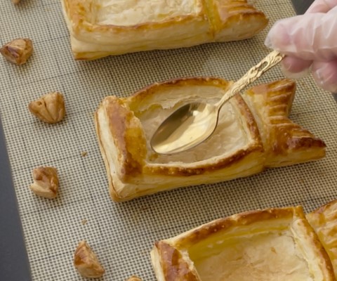 冷めたパイの中央部分をスプーンの腹で軽く崩します。