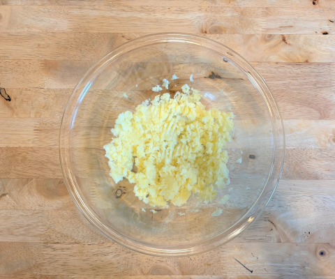 じゃがいもをフォークの背や、マッシャーなどで潰します。