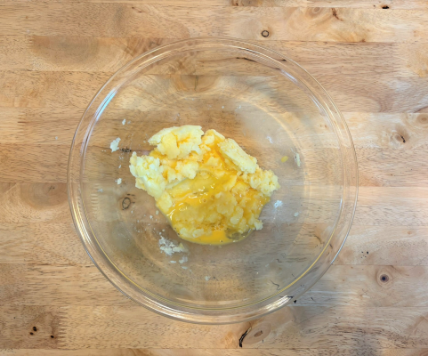 溶き卵を加え、卵をじゃがいもとよく混ぜ合わせ、しっかりとなじませます。