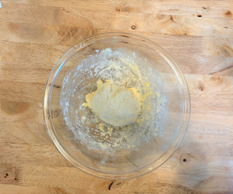 米粉を加えて、粉気が少なくなったら手でしっかりこねてひとまとめにします。