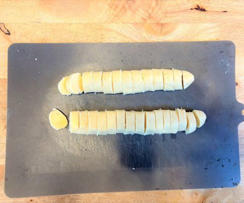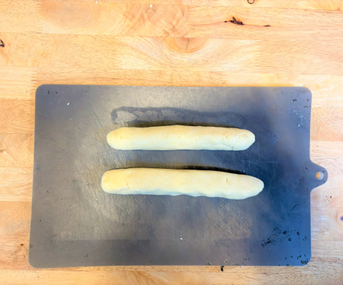 ④の生地を二等分にして棒状に伸ばします。打ち粉(分量外の米粉)をしながら作業します。※打ち粉をしすぎると、生地がぽろぽろしてきてしまいますのでご注意ください。
