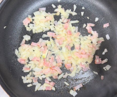 ベーコンと玉ねぎはみじん切りにしておきます。